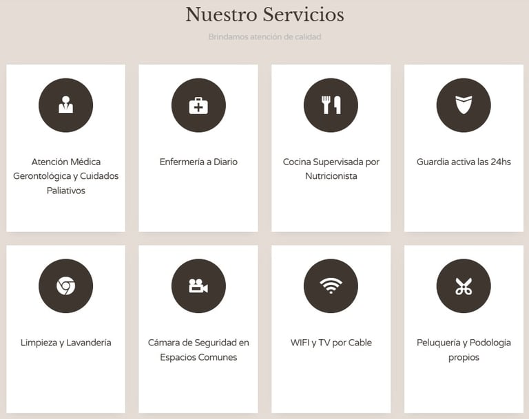 El establecimiento está completamente capacitado para dar el servicio de pensión en forma completa, con habitaciones triples o cuádruples, de acuerdo a las necesidades especificas de cada paciente. Medicina clínica geriátrica y prestaciones adicionales como sistema de emergencia médica las 24 horas, stock permanente de medicamentos y materiales descartables de farmacia, enfermería especializada, peluquería y manicura, terapia ocupacional, kinesiología, Servicios Externos de psicología, evaluaciones y otras especialidades.